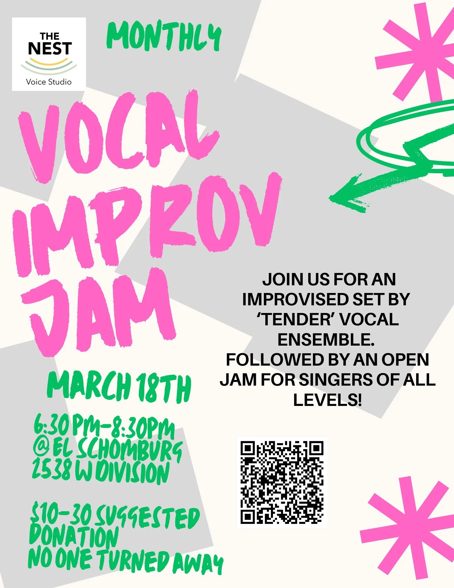 Come experience vocal music that invites you to rest, reflect, and feel the resonance of collaborative creation. This event is for singers across genres and styles who are looking to deepen their practice, develop a more intimate relationship with their voices, and feel the support of others in hearing and making new sounds. The evening opens with a short set from Tender, a vocal ensemble (including but not limited to Stacy Erenberg, Emmy Bean, Jacob Rosner, Yvette Mushimiyama, Michele Thomas and friends) and continues with an open jam for all to join or listen to at your own pace. Singers at any level of experience or training are welcome, and we are eager to share this space with you for musical practice, rejuvenation, and real human connection.